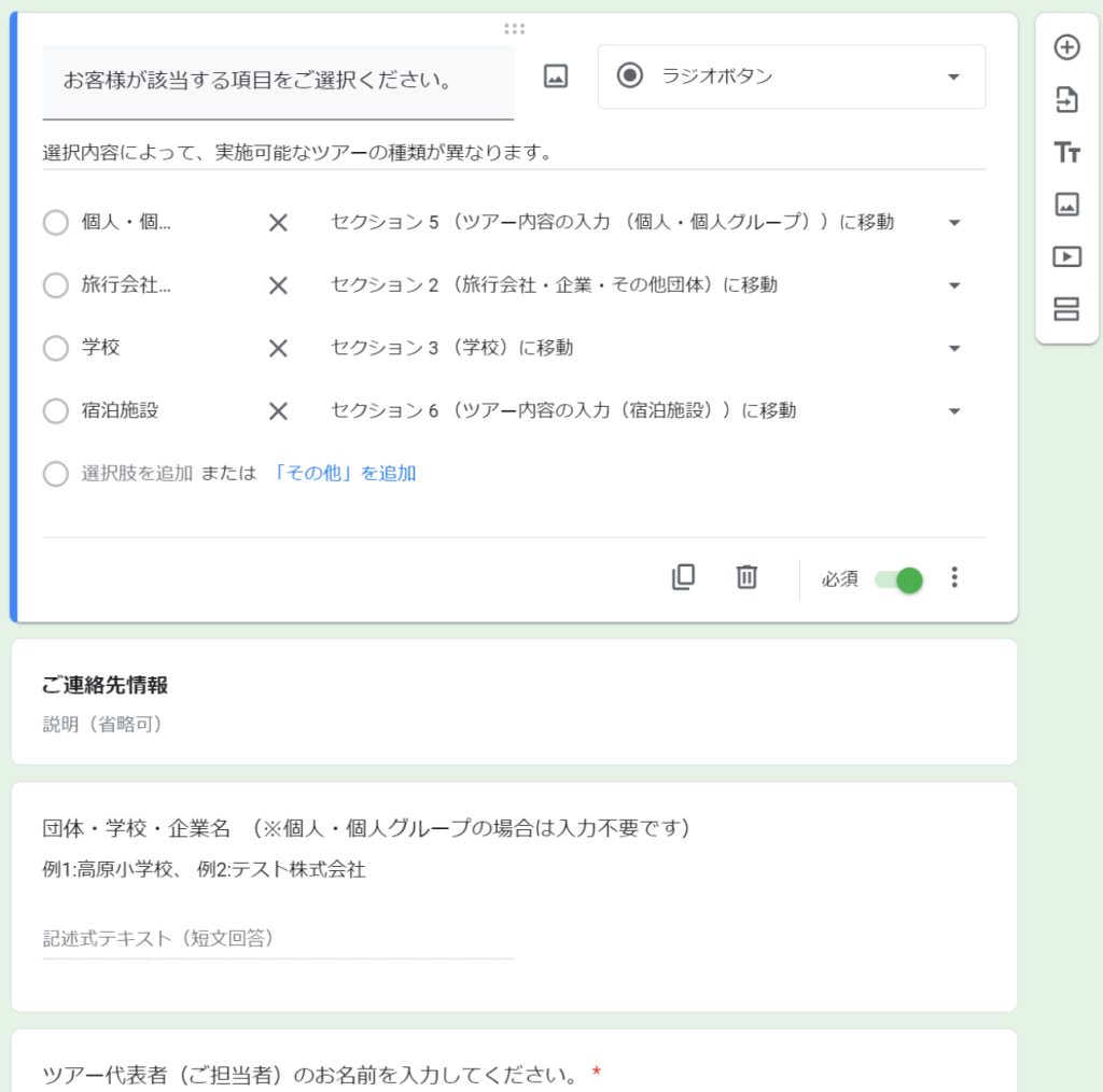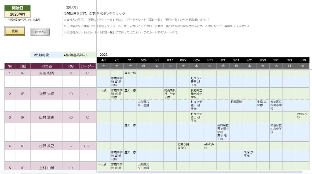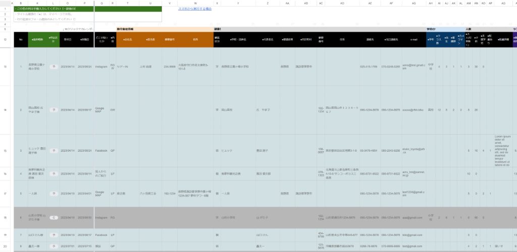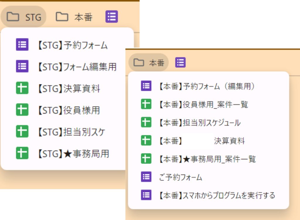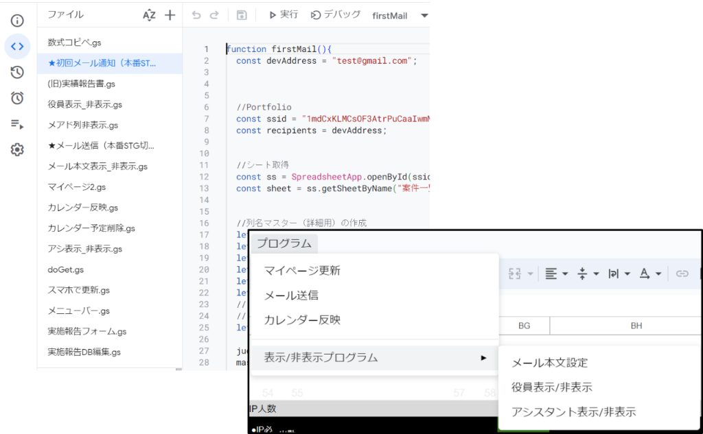 システム一元管理 (DX化) Centralized system management Excelで個別に手入力していたものやペーパーワークしていたものを、システムにより大幅に自動化(DX化)しました。 予約フォームから送信されたデータをスプレッドシート「案件一覧表」に登録し、マスターとなるDBにしています。これを元に、カレンダー連携、登録者ごとの個別ページ、日程表などにデータを渡しています。 また、使う人が困らないよう、機能や使い方をまとめたマニュアルも作成しお渡ししています。 システム構成 システム構成は以下のようになっています。 「案件一覧」をマスターとなるDBとする。 案件一覧に「料金表」と「担当者一覧」を登録しておく。WEB上の予約フォームから送信されたデータを案件一覧に自動で反映する。入力内容を管理者にメール通知する。DBのデータをカレンダーに自動反映。└ 上書きなどの変更を自動検知し、カレンダーを自動更新実施日の1日前にDBの情報を元に自動で「実績報告書」を生成。担当者毎の年間予定をリアルタイムで更新。└ 日付を動的に変更可能(過去の予定も同じシートで確認可能)役員様用に予定をリアルタイム更新└ ボタンクリックでPDFをメール添付して送信担当者毎の専用の個別ページを自動生成、リアルタイム更新収支情報を集計し、決算集計表に反映(年度ごとに選択可能) 以下で機能の一例を紹介しています。 予約フォーム 予約フォーム -DEMO- ユーザーの入力内容によって、条件分岐を設定しています。 > 【DEMO】予約フォーム 案件一覧(DB) 案件一覧表 -DEMO- 入力フォームからのデータを自動転記します。フォームは複雑に分岐しているため、見やすいようにデータを成形しています。データは上書き可能で、必要に応じて更新することができます。 > 【DEMO】案件一覧 主な機能 入力フォームからのデータを転記(トリガー設定) 入力フォーム受信時、自動メール通知(Gmail連携) 実績報告書の作成(指定日1日前に自動生成、データ取得、指定ユーザーのみ権限設定) メール送信機能(送信するメンバーや送信内容の組み合わせ選択。ヘッダー・フッター文章のカスタマイズ) カレンダー反映(ステータスによる登録/削除の自動化。データ内容を検知して変更がある場合に自動更新) 複数のプログラム実行手段(「実行ボタン」「上部メニュー」「リンク(スマホ用)」「トリガー(バッチ処理)」) 担当者毎に内容をカスタマイズした個別のシート(マイページ)の自動生成と自動更新 条件付き書式によるデータの色分け 以下で機能の一例を紹介しています。 プログラムの実行 メールの自動送信やカレンダー連携、マイページの更新など全部で12個のプログラムを作成しています。ユーザーが実行する必要があるプログラムは「ボタン」または「メニュー」から操作できるようにしています。 メール送信 メール送信機能では、本文に記載する内容をカスタマイズしたり、宛先を複数の選択肢の中から選ぶことができます。特に、98個の項目に✓を入れることでメール本文に記載したい内容を自由に変更できるようにしています。(使い方のイメージは動画をご参照ください)プログラムとしては、タイトルと本文のデータを取得し、チェックのあるタイトル項目の配列を作成してから、Key-Valueのセットを作成し、メール本文となる文字列データを生成する処理をしています。 マイページ 担当者毎に割り振られた案件や、募集中の案件のみを表示するマイページを自動生成・自動更新するプログラムを作成しています。ここが最も工夫したところです。本番環境では担当者が40人以上います。それぞれの人向けにデータを加工し、表示する処理を6分以内に収める必要があります。データの取得方法やデータの呼び出し方法を工夫することで、全体の更新を3分程度で完了できるようにしました。 担当者別スケジュール 主な機能 マスターDBのデータリアルタイム取得日付更新日付と名前による2重データ検索行列の表示/非表示切り替え データ自動連係による効率化 このシートで取得しているデータは、案件名や担当者の名前などマスターとなっている案件一覧から取得しています。日付毎の案件表示も全て自動化することで、これまで手動で作成していた作業を大幅に削減しています。データがない行と列を非表示にする処理は高速化のため、対象列を2次元配列で取得し処理しています。 プロジェクト管理 STG(開発環境)と本番環境 プログラム開発時は将来的な追加開発や修正などを考慮し、STG(開発環境)と本番環境を分けて開発を行うようにしています。コードもSTGから本番への移行が簡単になるよう組んでいます。(基本的にはコードファイル冒頭のコメントアウトの切り替えで対応)
