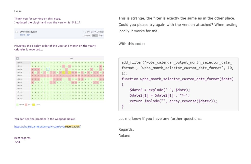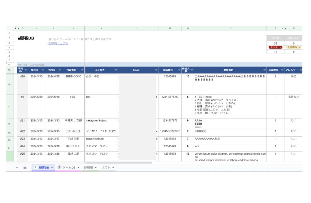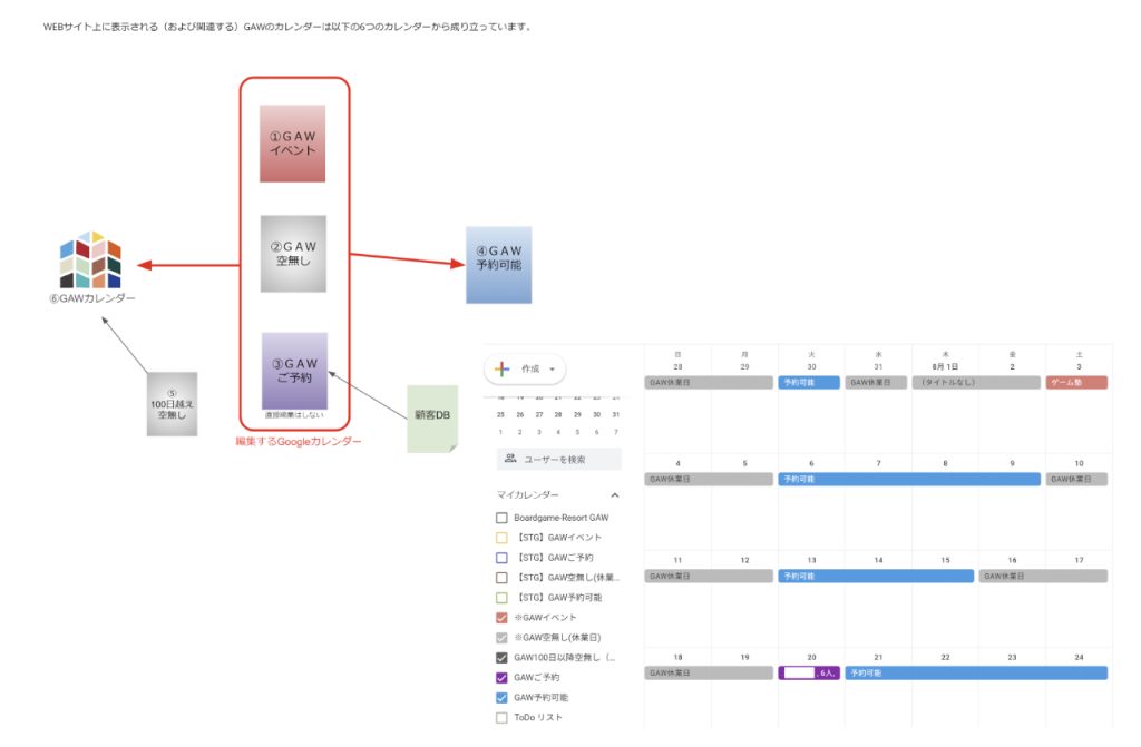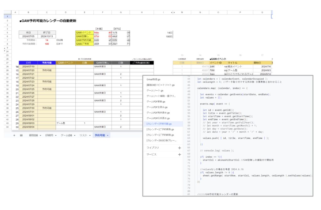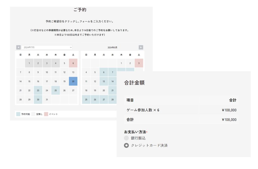 オンライン決済・予約システム Online payment reservation WEBサイト上でクレジットカード決済を導入にした予約システムを実装しています。WEBアプリケーションは海外のものを用い日本語化対応をしています。日付フォーマットなど日本語に対応していないものは海外のデベロッパーに連絡をとり、修正版をリリースしてもらうなどの対応をしています。また、予約完了後のデータをGAS(Apps Script)で連携して取得し、裏側の顧客管理システムと連携しています。ユーザーからのご要望により、WEBサイト上の全ての予定をGoogleカレンダー経由で操作できるようにカスタマイズしています。 予約・決済機能(フロントエンド) カレンダーの日付を選択して、支払い・予約をすることができます。 カレンダーからの日付選択カレンダーの自動更新(14日以降、100日以内)選択内容による入力ボックスの出し分け(条件分岐)クレジットカードオンライン決済自動メール通知リマインダーメール通知(開始3日前)カスタムHTMLメールetc… > 予約・決済ページ(※DEMOページではありません) 管理画面 予約システムの管理画面はフルカスタムし、必要な情報のみを表示しています。 必要なメニューのみを表示(他を非表示)専用のカスタム権限を作成プラグイン名のカスタマイズ(PHP)日本語化etc… オンラインマニュアル オーナーだけでなく、社員やアルバイトが使うことも想定し、機能や使い方、主要リンクなどをまとめたオンラインマニュアルを作成しています。 アクセス権限の設定検索機能カテゴリー別ナビゲーションetc… 海外デベロッパーとのやりとり 開発に際して、不具合や日本語化対応など、海外のデベロッパーと30回以上のやり取りを行い、複数回のプログラムのバージョンアップをしてもらいました。元々HONDAで働いていたときに、海外拠点のメンバーとメールやテレビ会議によるコミュニケーションをしていたり、海外で2年間弱働いていた経験が生きました。 Backend 顧客管理システム 予約フォームからの送信データを別のアプリケーション(GAS)で取得し、顧客DBを構築しています。 メール自動検知(バッチ処理)メール情報取得とシートへの転記ソート機能リピート検索機能(代表者及び、参加者のリピート回数検索)Googleカレンダー連係内容変更検知によるカレンダー自動更新ゲームDBとの連携印刷用データ自動生成etc… カレンダー自動更新プログラム WEBサイト上の予約カレンダーは14日以降~100日以内予約可能という1日毎に予約可能日がローリングします。この仕組みは、Googleカレンダーで自動更新する予定を作成し、iCalでWEBサイトの予約ページのカレンダーと連携させることで実現しています。 Googleカレンダー上での予約カレンダー操作 WEBサイト上の予約カレンダーは管理画面からも操作するのがアプリケーションの仕様ですが、ユーザーから日常で使用している「Googleカレンダー経由で操作したい」とのご要望がありました。このため、Googleカレンダー経由で予定の登録・削除を行うと、WEBサイト上のカレンダーの予定もリアルタイム更新するプログラムを組み込みました。 予約可能カレンダー ユーザーから「予約が可能な空いている日程だけを見たい」という要望があり、これにこたえるために、予約カレンダーと連携している4つのカレンダーの予定を取得し、その裏(空きのある日)を算出して、カレンダーに反映するプログラムも組み込みました。「こんなことできますか?」みたいな相談や、新しいことへの挑戦・新しいスキルの取得はいつもワクワクします。